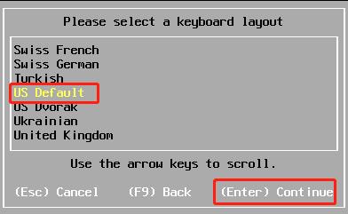 在“Please select a keyboard layout”界面中选择“US Default”(默认美式键盘),点击【Enter】 键继续安装,如下图所示。